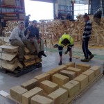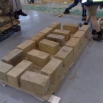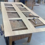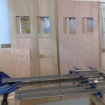 With the time & effort involved in making 2 very noice Vic-ash entry doors, I decided to go for a ply paneling for the sides and rear. I’ll use more Vic-ash for the corners. I thought that the ‘easiest’ way to obtain the detail in the panels was to jigsaw/rout the 4 x 2 rectangles on the top 6mm piece, cut just the windows in the middle 3mm piece and then cut just the windows in the 6mm bottom piece. Hopefully the jig works and all the pieces match. The mammoth task of gluing and clamping was accomplished with heavy brick blocks which are otherwise used by carpentry apprentices as ‘stumps’ for building a house.