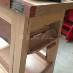 The legs became the stand itself for strength and support of the top and the press. I’d found some pieces of discarded red gum (in the bin!) at TAFE and so joined and dressed those up for some finer detail work (edging and pull knobs). I left some holes and original weathered sections as features.
