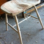 Knocking each one of the highly strung pieces of leg timber emits certain musical notes, with which one can also perform a chair melody. Lining up the legs is done by eye and each hole is drilled by hand. The advantage of drilling by hand is that you can feel the slightest pressure of the drill bit emerging from the other side of the chair seat (the proper side where a bottom goes) and back off at that point. Of course your aim needs to be pretty good in the first place.
