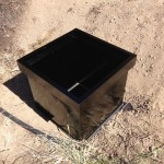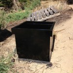 The slope from the tanks down to where the drain box is is an issue as the level is too steep for a stable base with the potential issue of subsidence and undermining of the closest tank.Consequently I had to build a (fairly simple) box. The first one I’d used 20mm treated pine had started to warp, so take 2 with 38mm treated pine and several structural reinforcements. I’d also liberally applied several layers of bituminous paint.